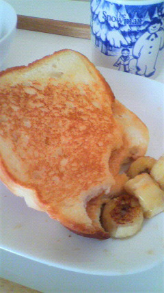 熟したバナナのペーストとピーナッツバターを塗った食パンを